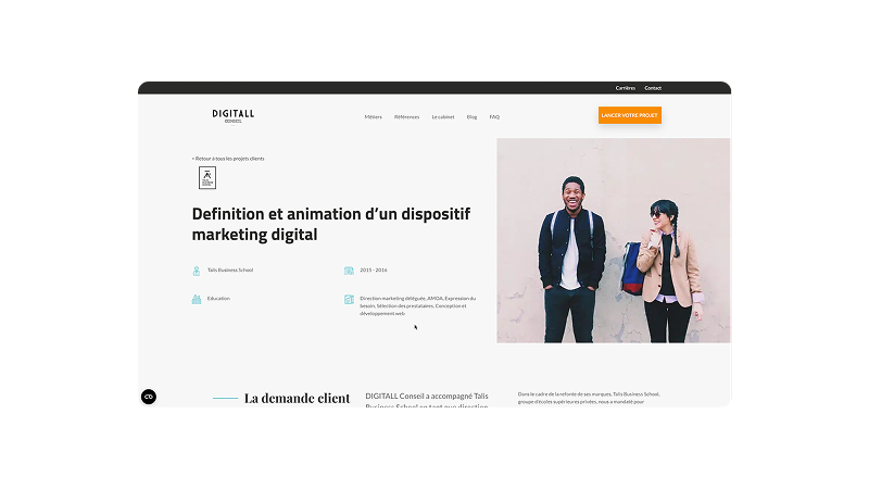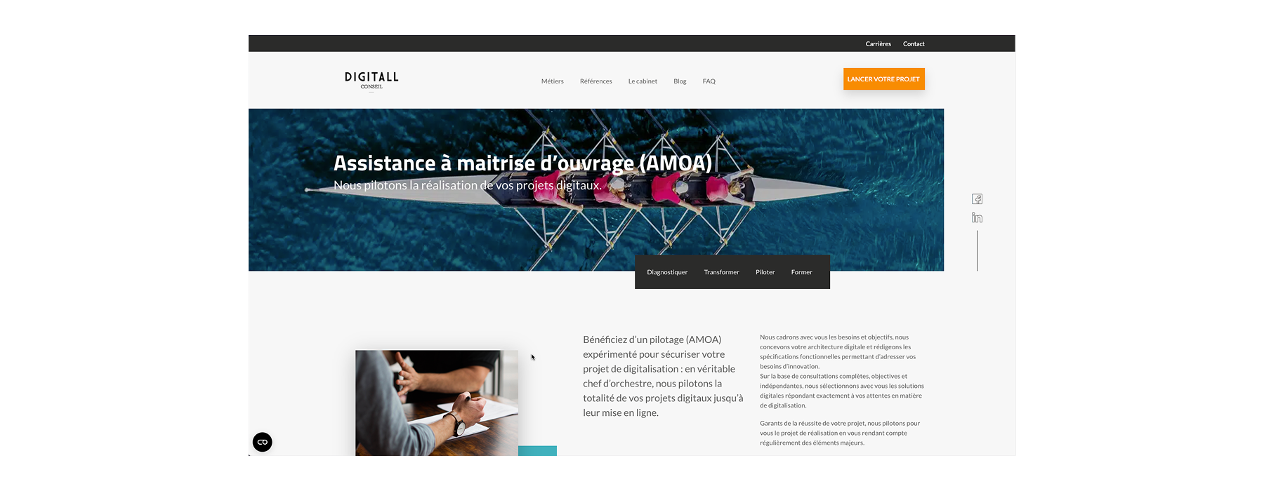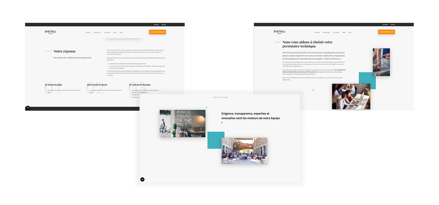 As the in-house UI/UX Designer and Front-End Developer at DIGITALL Conseil, I was responsible for designing and building the company’s new website using WordPress. After several rounds of discovery sessions to fully understand the objectives and needs of the project, I collaborated closely with the entire DIGITALL Conseil team to develop a relevant and intuitive site structure. The goal was to clearly showcase the company’s wide range of expertise.