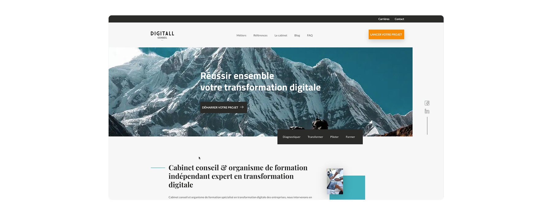 Once the site architecture was established, I focused on creating a clean, modern design that reflected the values of DIGITALL Conseil—professionalism, innovation, and digital responsibility. I then proceeded to develop the website, ensuring it was both functional and visually engaging.